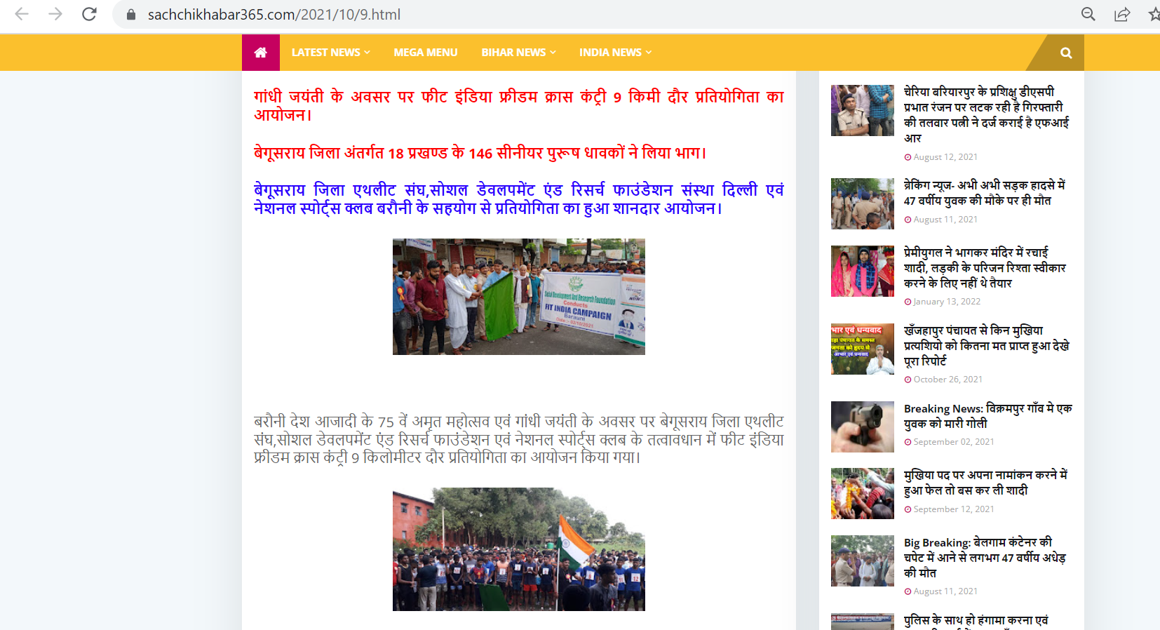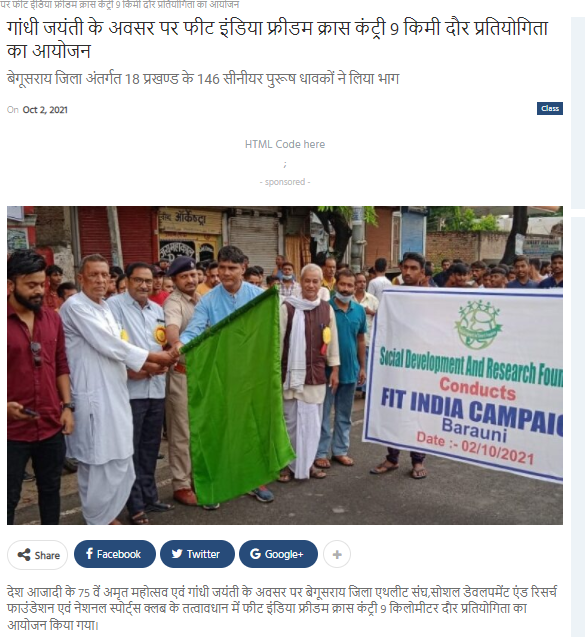 Organized a Fit India Campaign in Begusarai, Bihar for the first time to inculcate the importance of health and fitness in one's life. On the Occasion of Gandhi Jayanti, Lal Bahadur Shastri Diwas , SDRF along with the district president and the National sports club organized a 9km cross country race. It was a very successful event. 146 Senior male athletes from 18 blocks participated in the race with great vigor and enthusiasm.